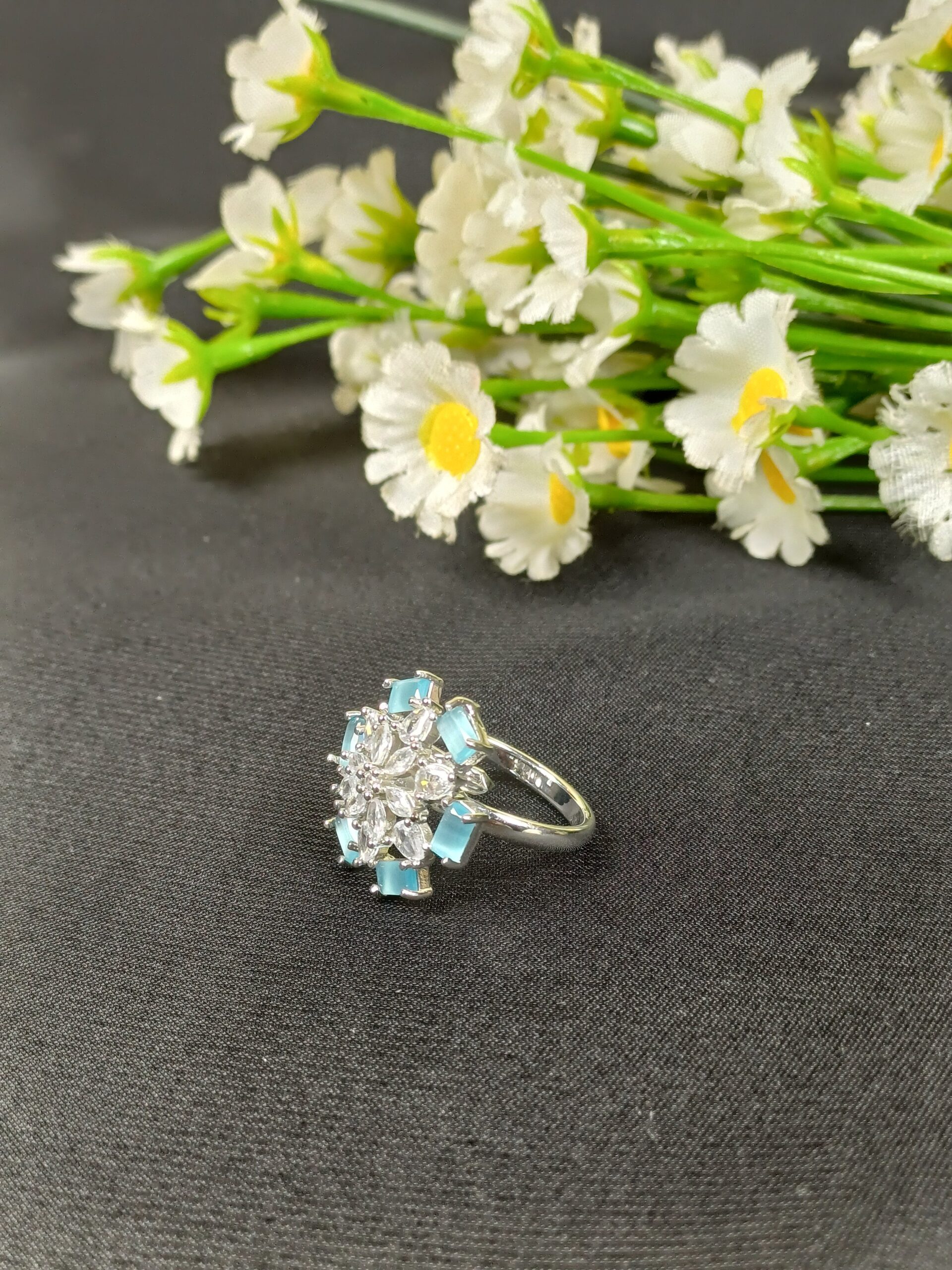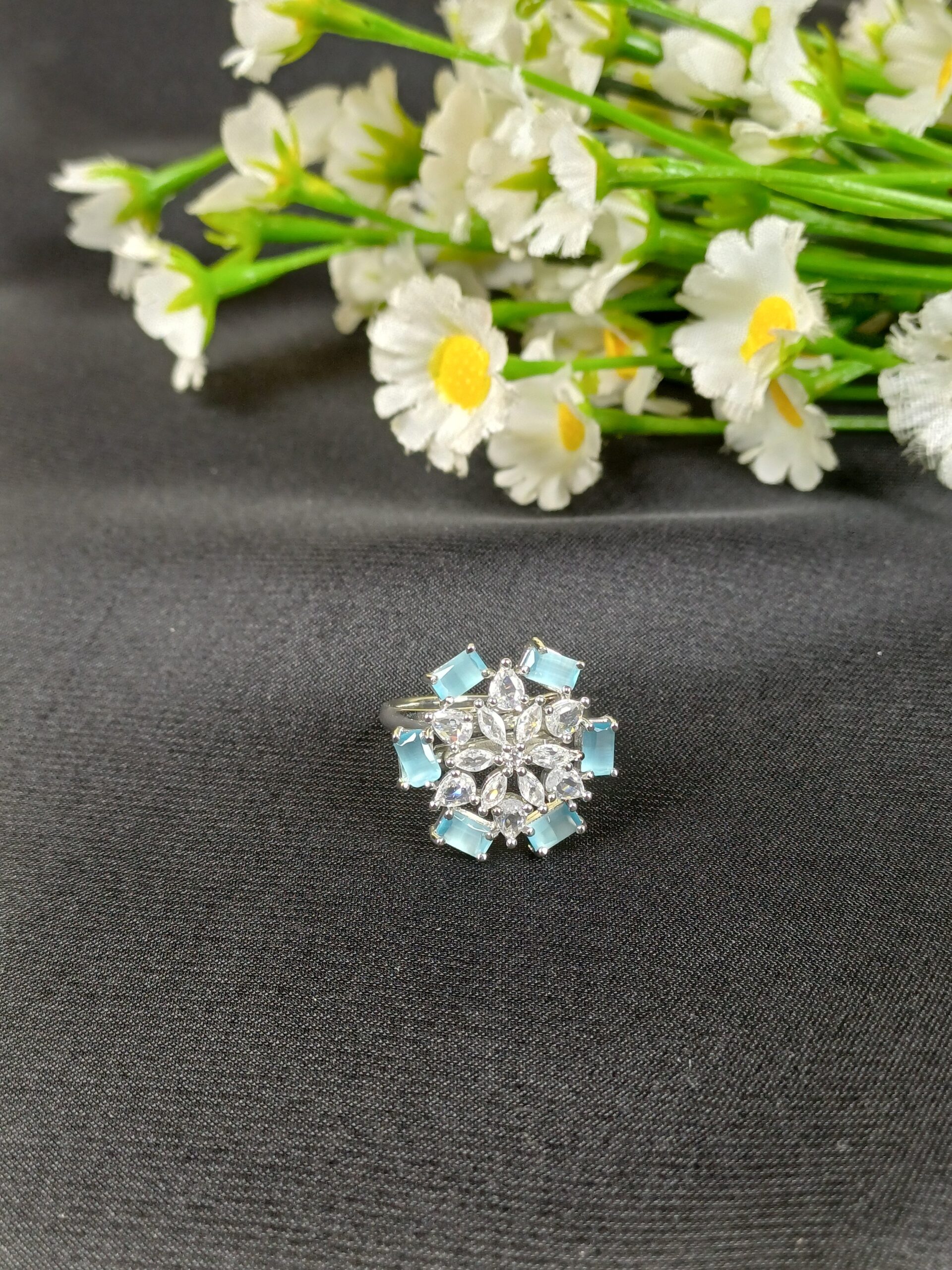This vibrant piece is a light blue snowflake statement ring, featuring a delicate geometric design that combines sharp baguette-cut accents with a sparkling crystal center.