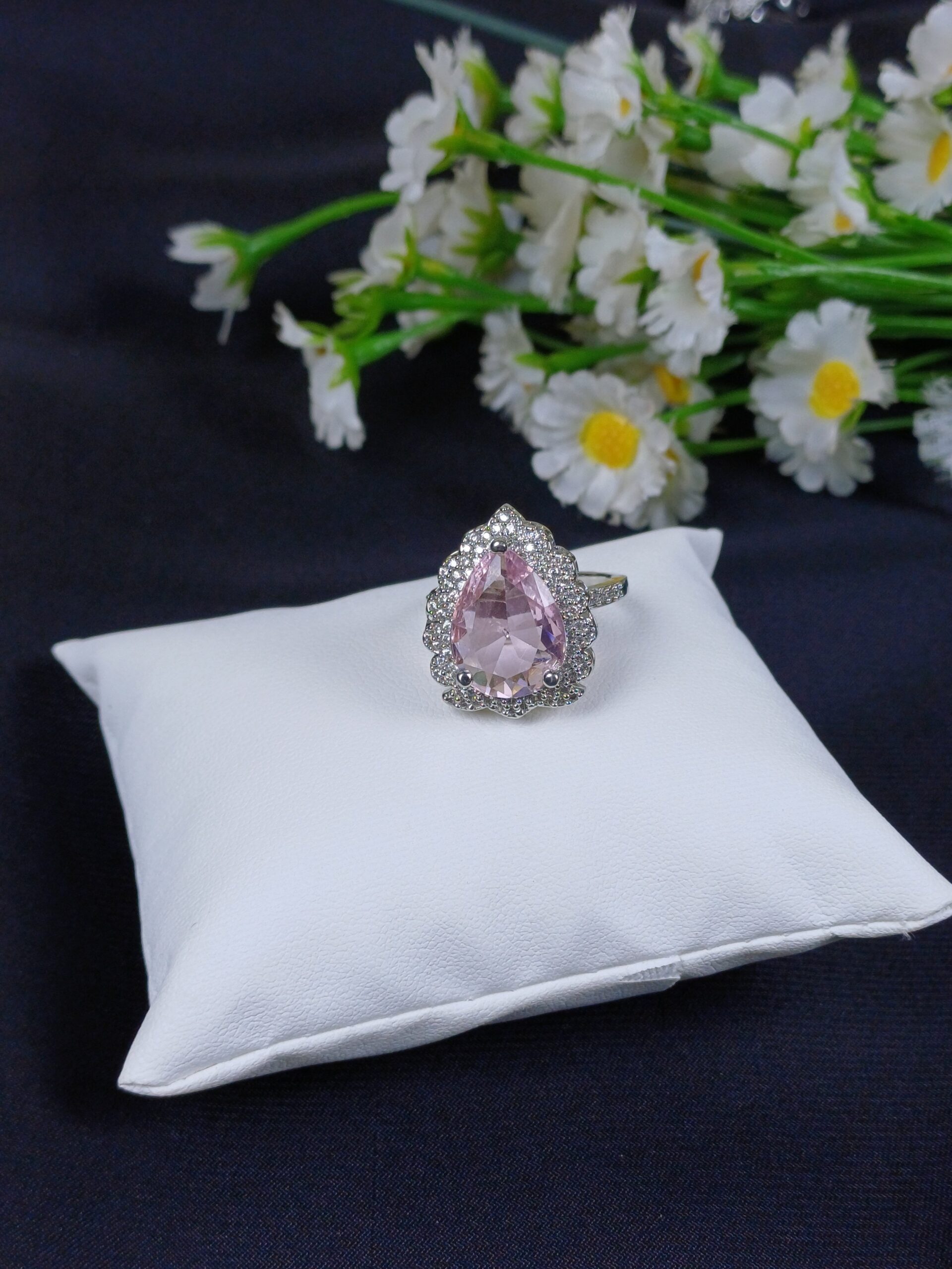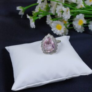 This final piece is a pear-cut halo statement ring, featuring a delicate pink gemstone and a scalloped crystal border for a classic, feminine look.