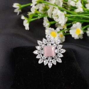 This sophisticated piece is an all-white crystal statement ring, featuring a dense, multi-layered sunburst design that maximizes light reflection for a high-glamour look.