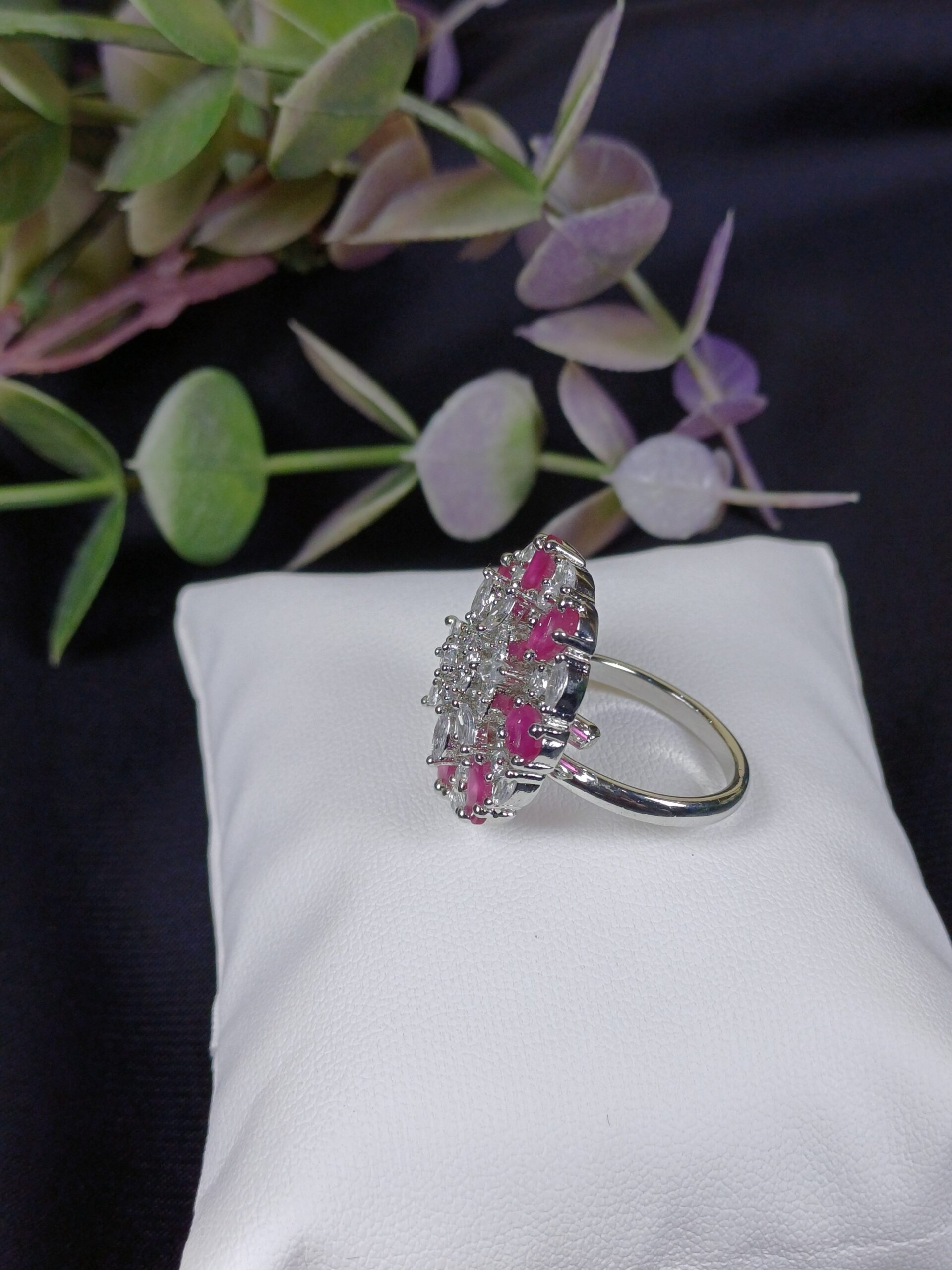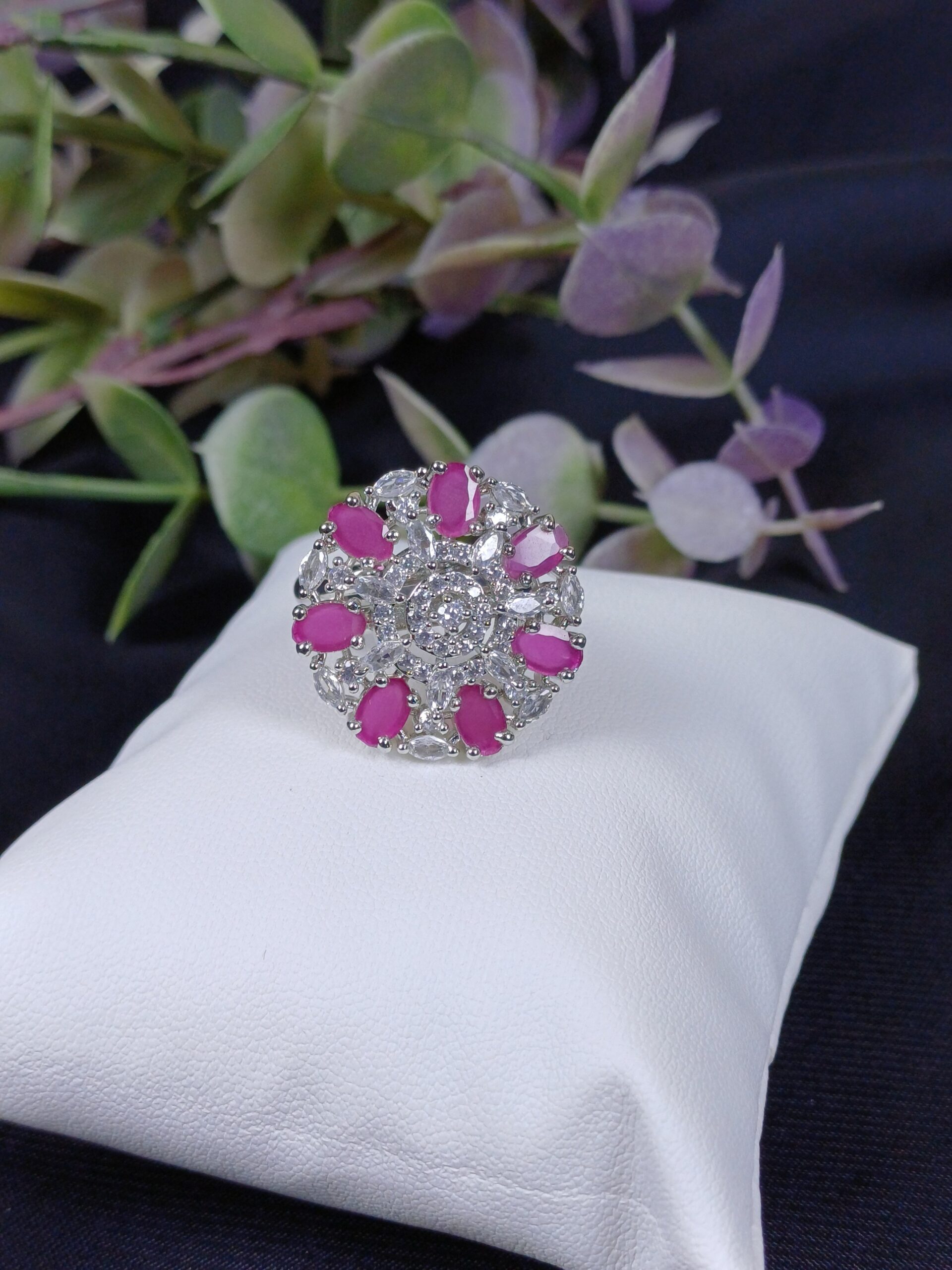 This striking piece is a vibrant floral statement ring, featuring a symmetrical, multi-layered design with bold pink accents for a striking and feminine look.