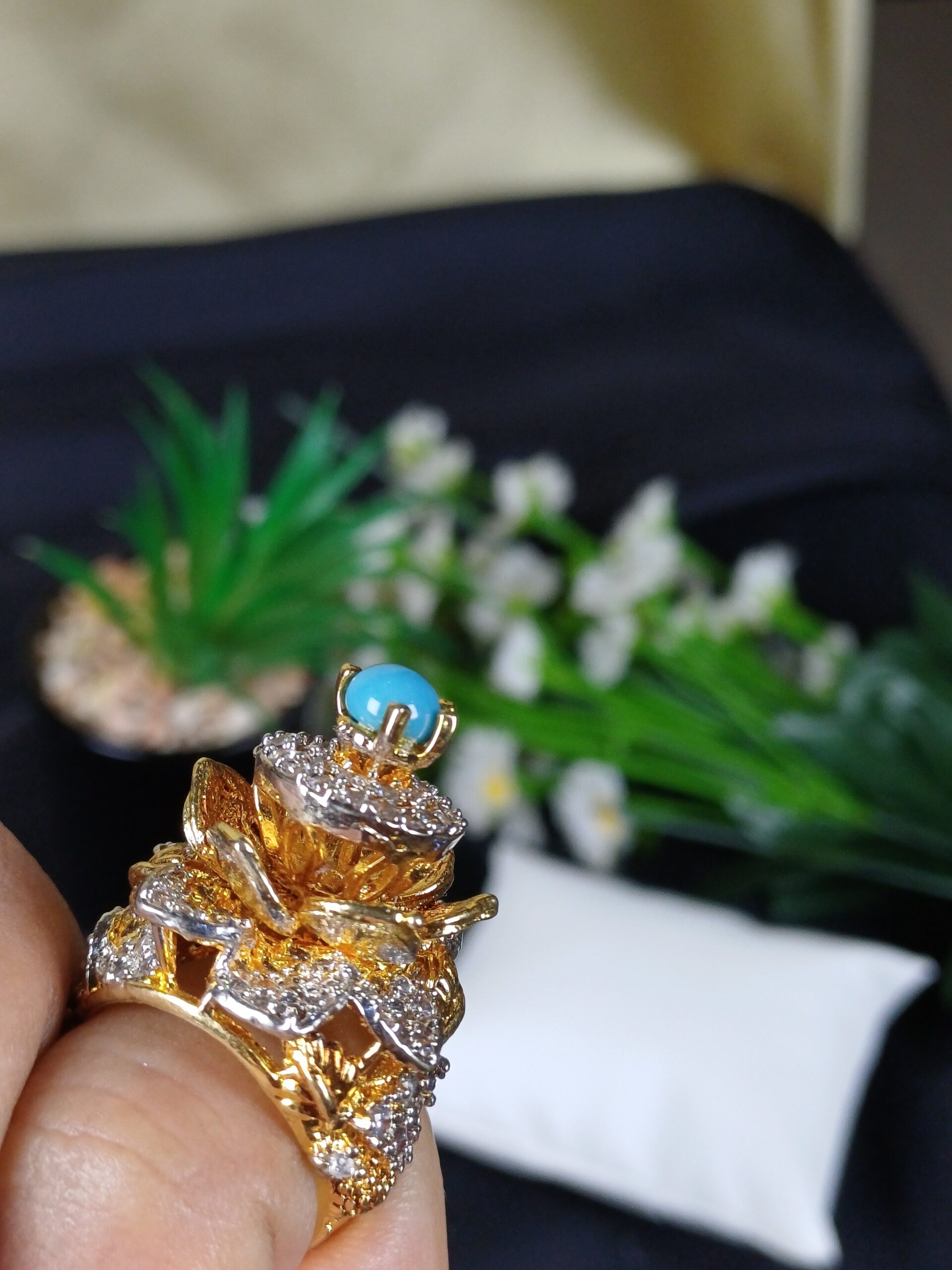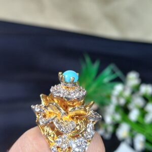 This ornate piece is a maximalist tiered floral statement ring, featuring a vibrant turquoise-toned topper and a highly detailed, multi-level botanical setting.