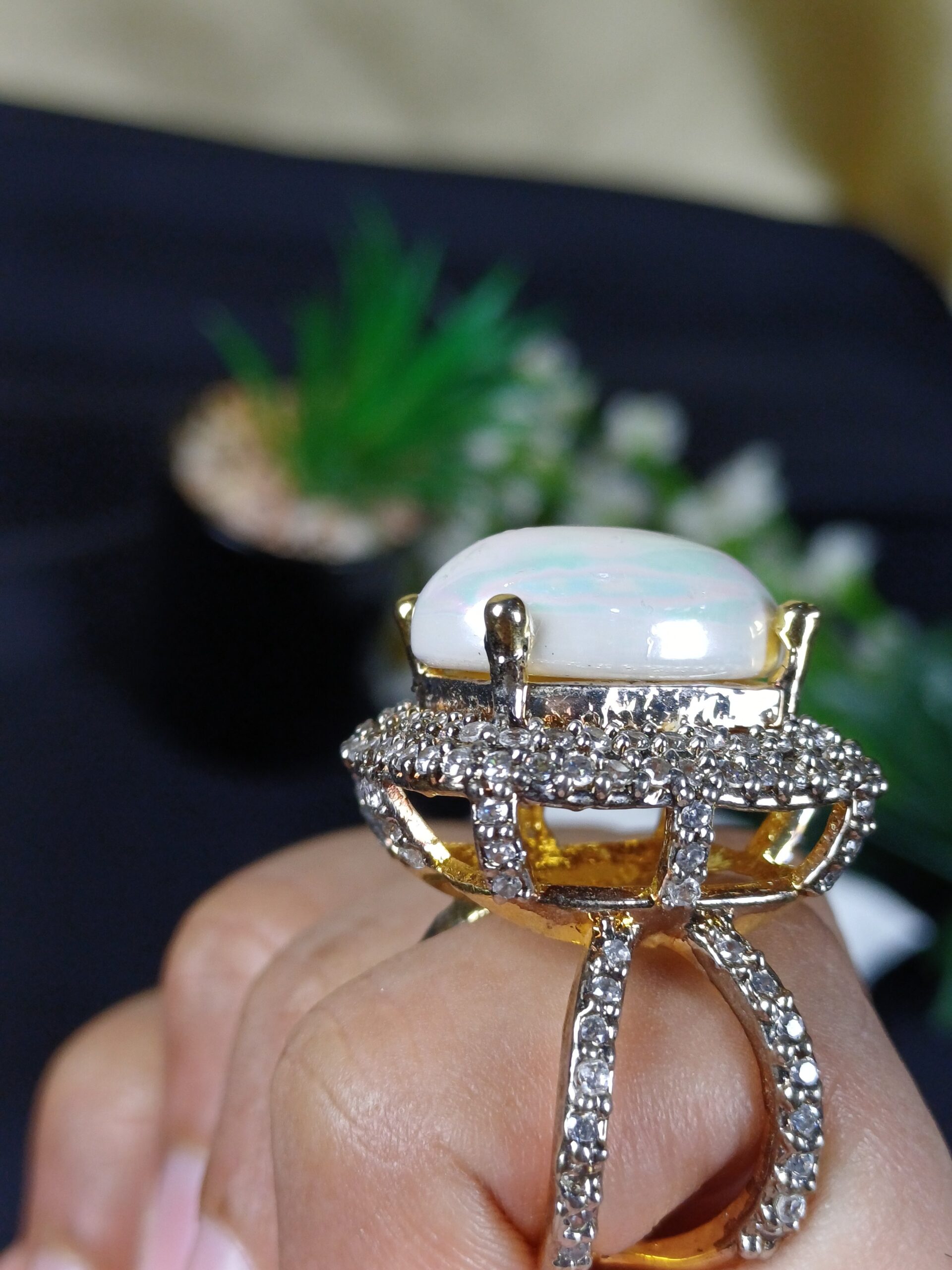 This magnificent piece is an architectural opal statement ring, featuring a luminous, oversized centerpiece and a complex, crystal-encrusted cathedral setting.