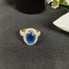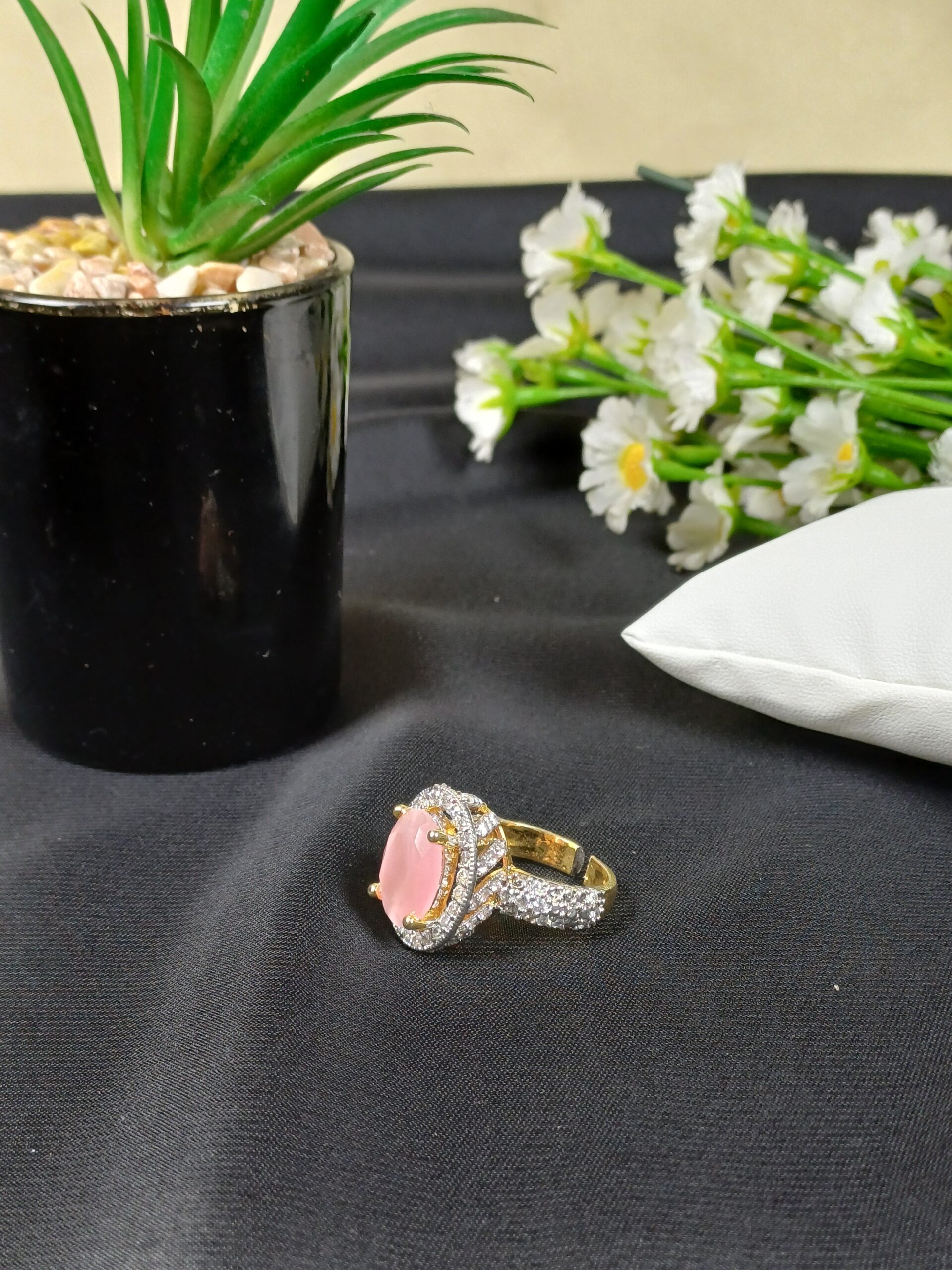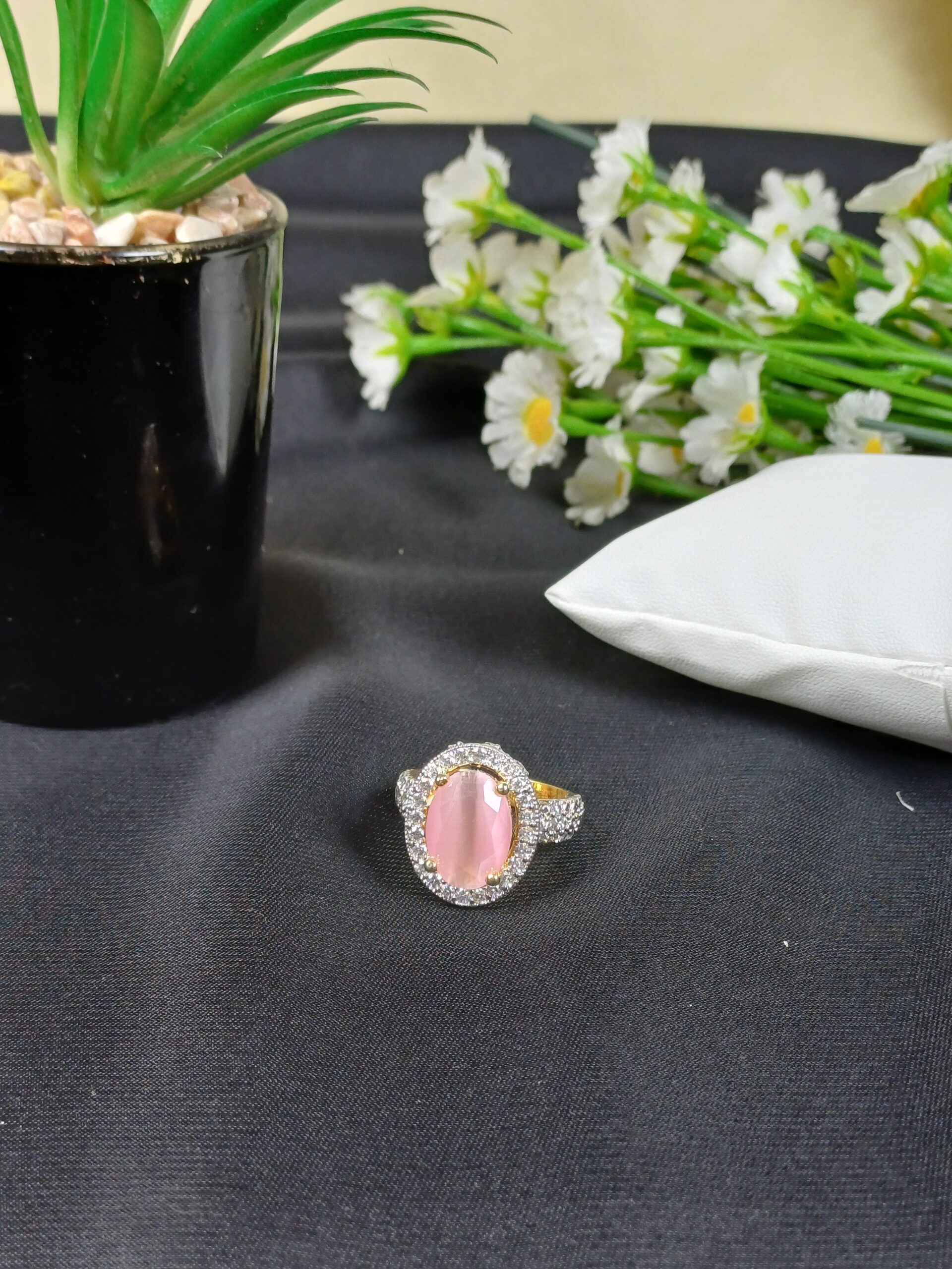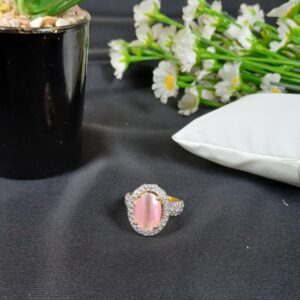 This graceful piece is a pink cat’s-eye cathedral ring, featuring a soft, glowing centerpiece and a wide, crystal-encrusted band for a romantic and substantial look.