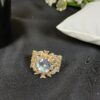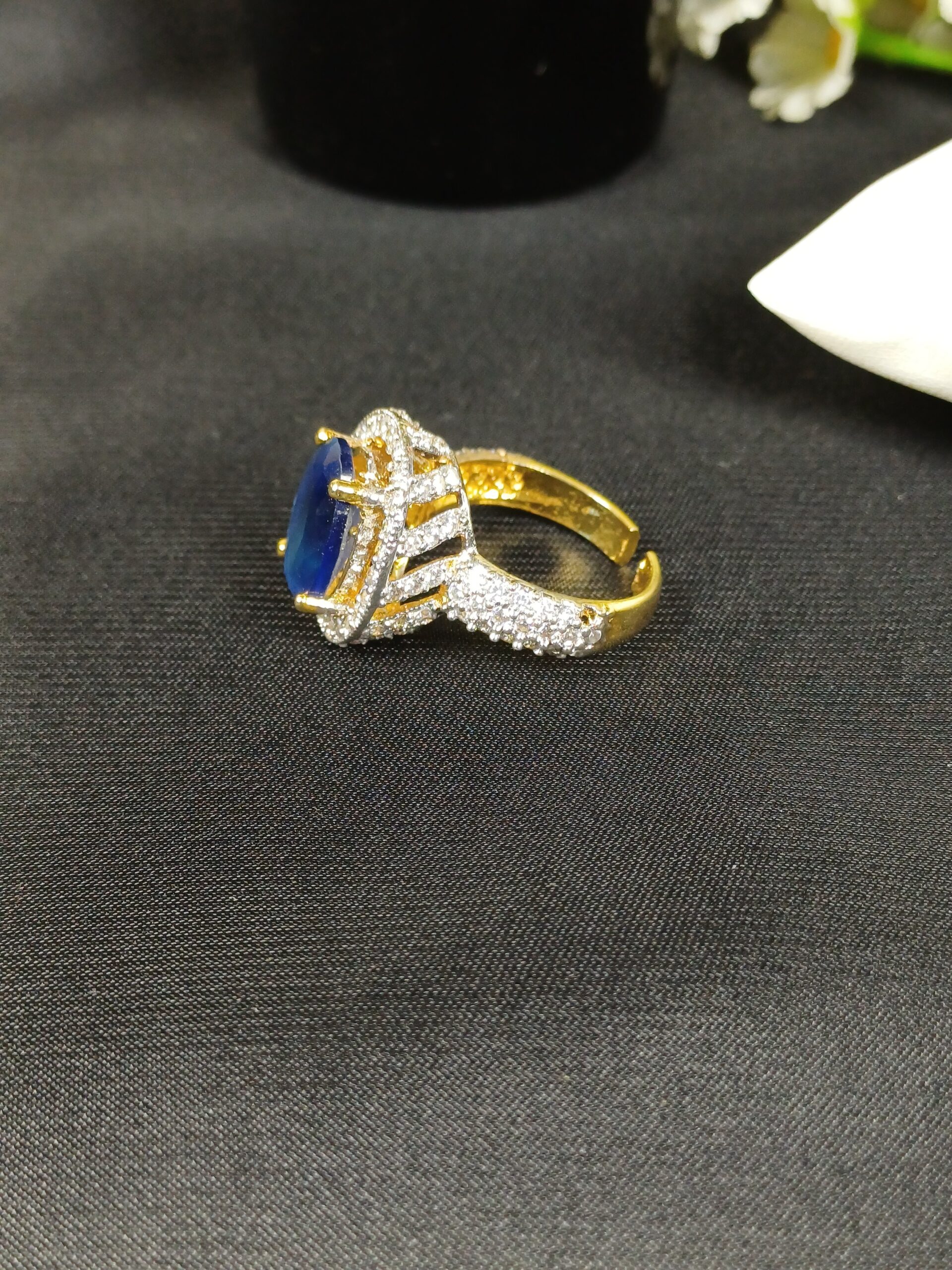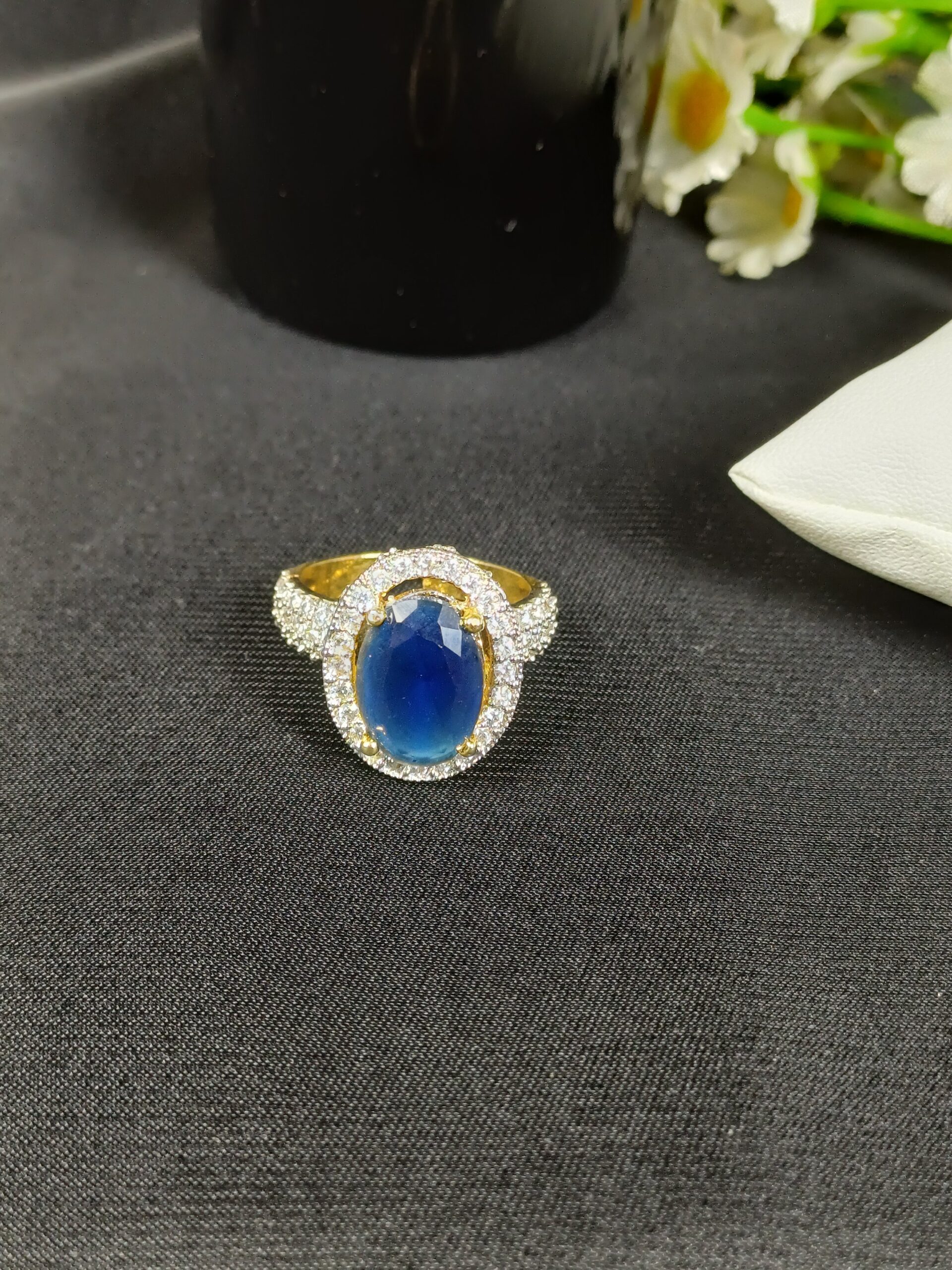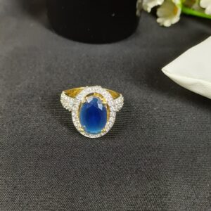 This sophisticated piece is a sapphire-toned oval halo ring, featuring a deep midnight-blue center and a brilliant pavé-set band for a high-jewelry, classic aesthetic.