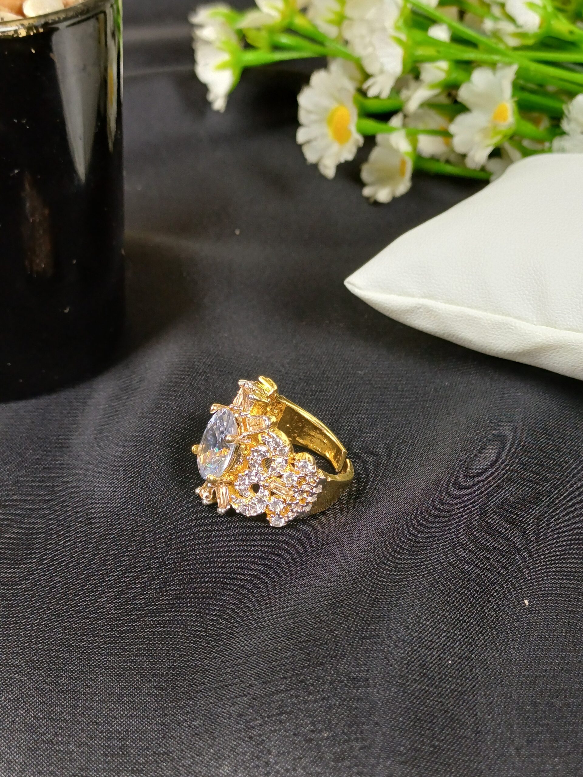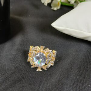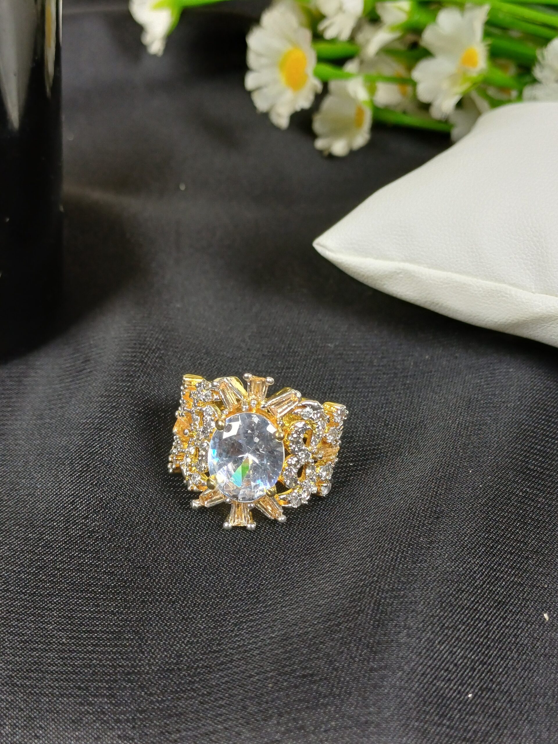 This elaborate piece is a maximalist crystal statement ring, featuring an architectural sunburst design and a brilliant multifaceted center for a high-jewelry look.