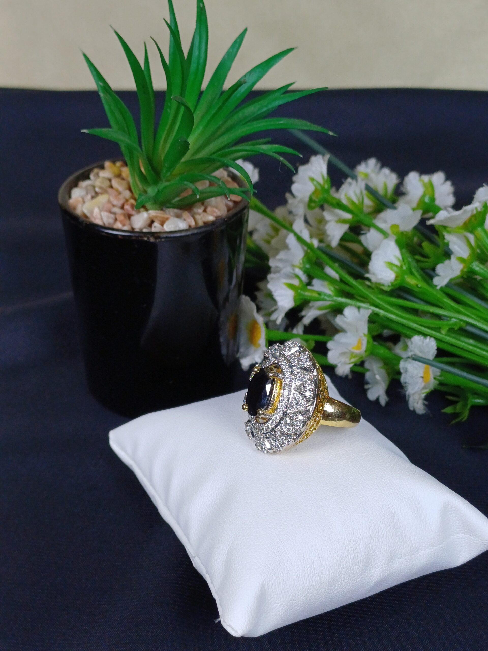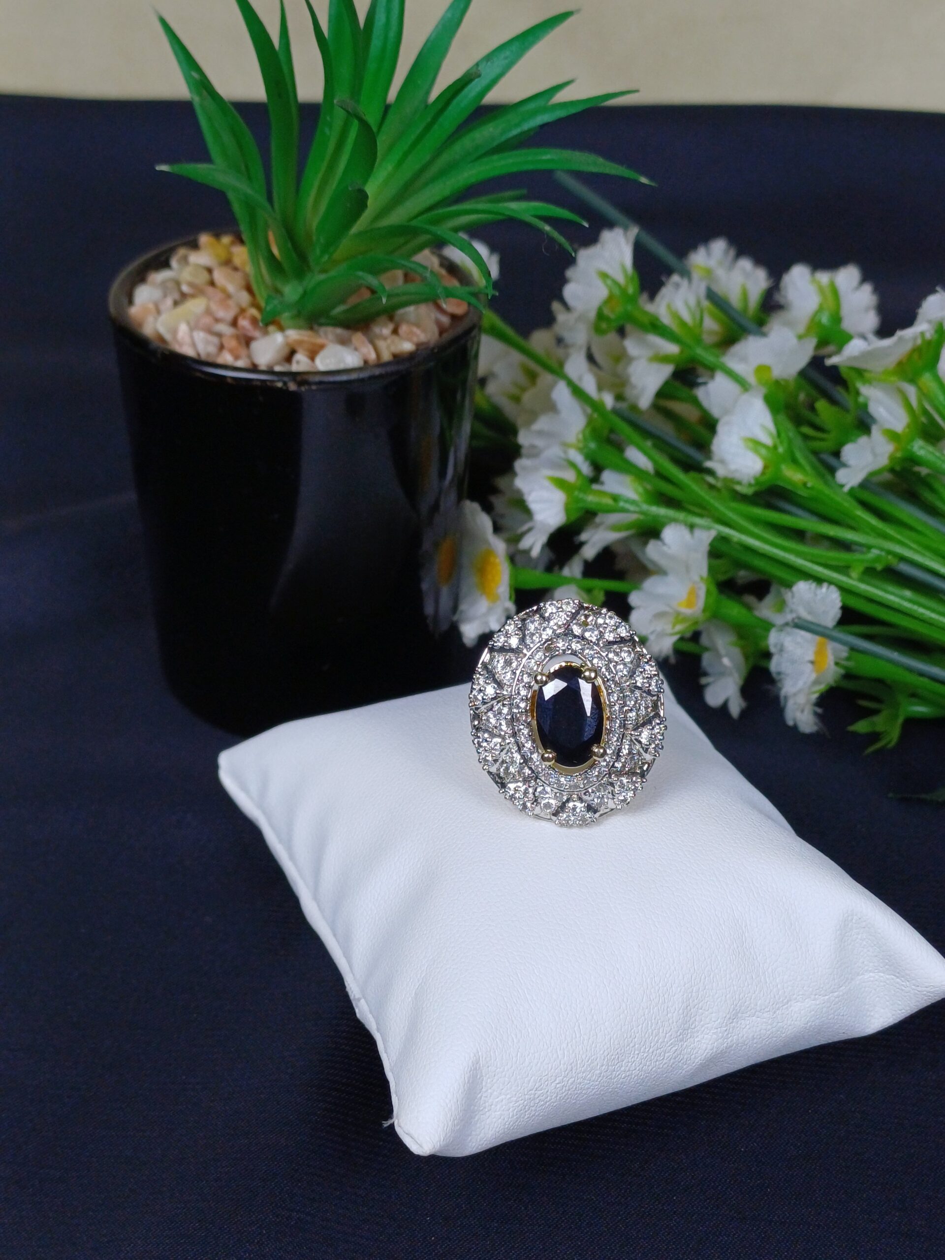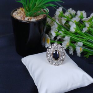 This sophisticated piece is a sapphire-toned oval filigree ring, featuring a deep midnight-blue center and an intricate, vintage-inspired lace frame.