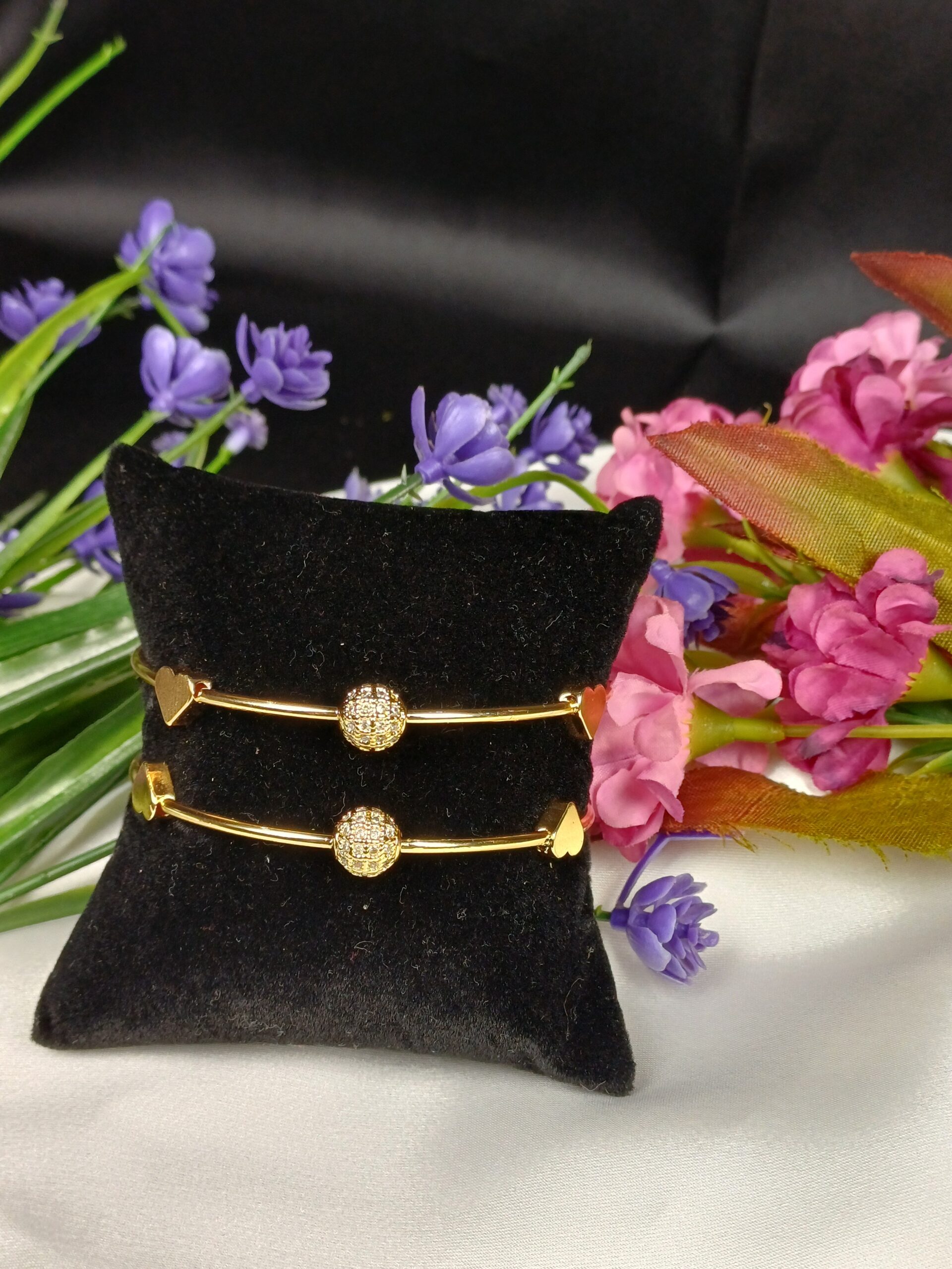 This sophisticated pair is a gold-toned crystal globe kara set, featuring a minimalist yet radiant design with romantic heart accents.