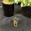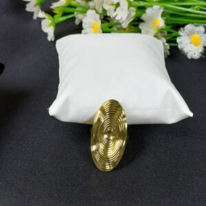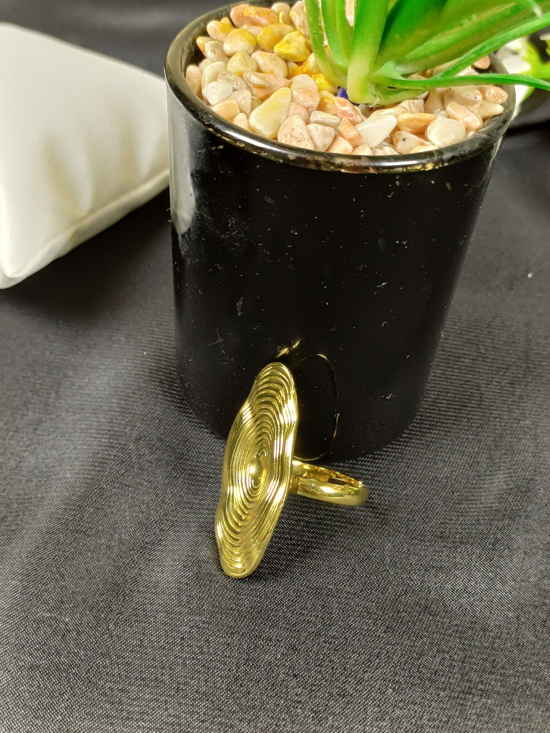 This avant-garde piece is a sculptural gold-toned cocktail ring, featuring a bold, textured oval design that draws inspiration from topographical maps or ripples in water.