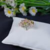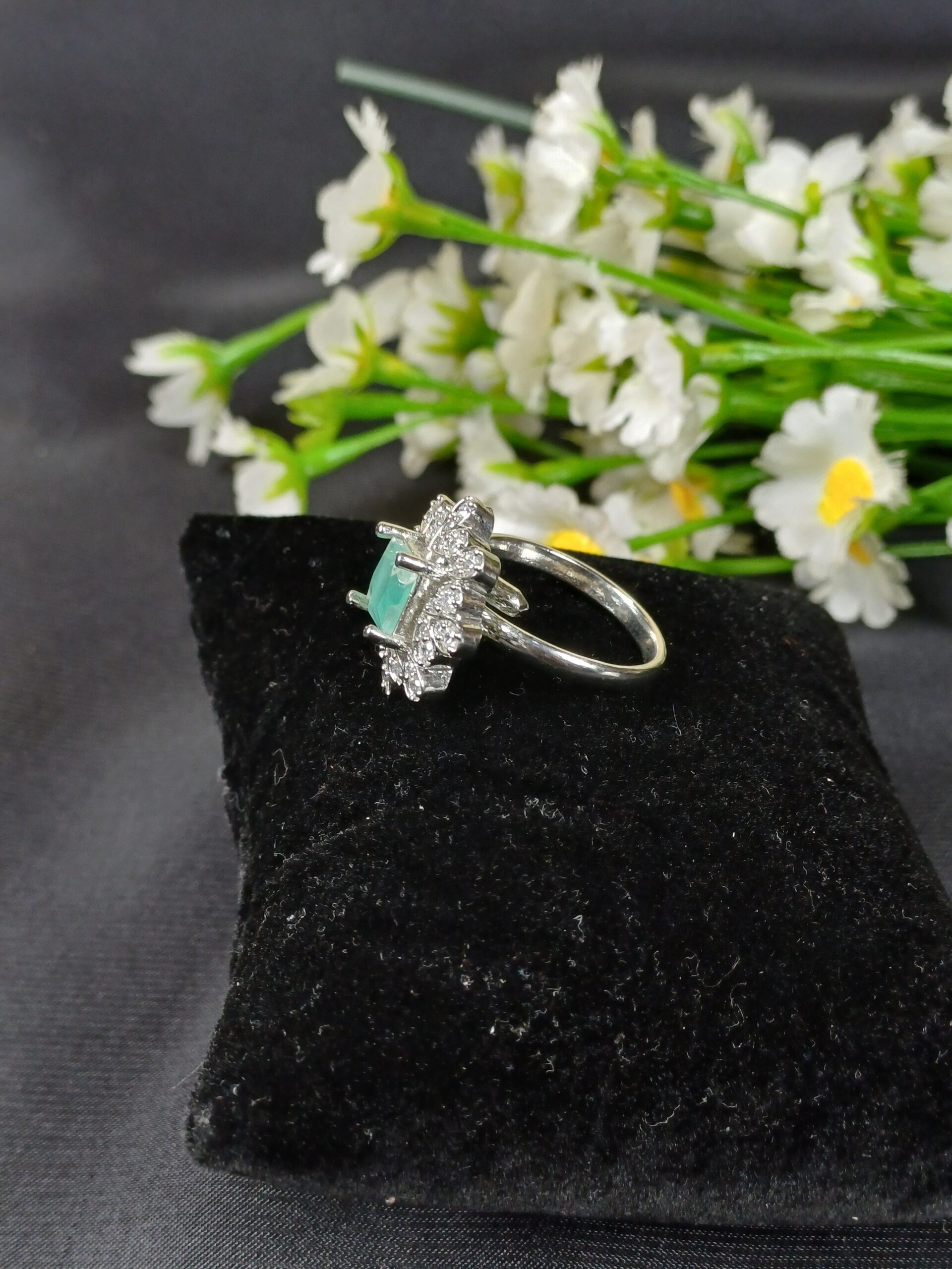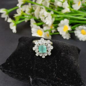 This vibrant piece is a mint-and-silver halo statement ring, featuring a structured geometric center surrounded by a delicate, flower-like crystal border.