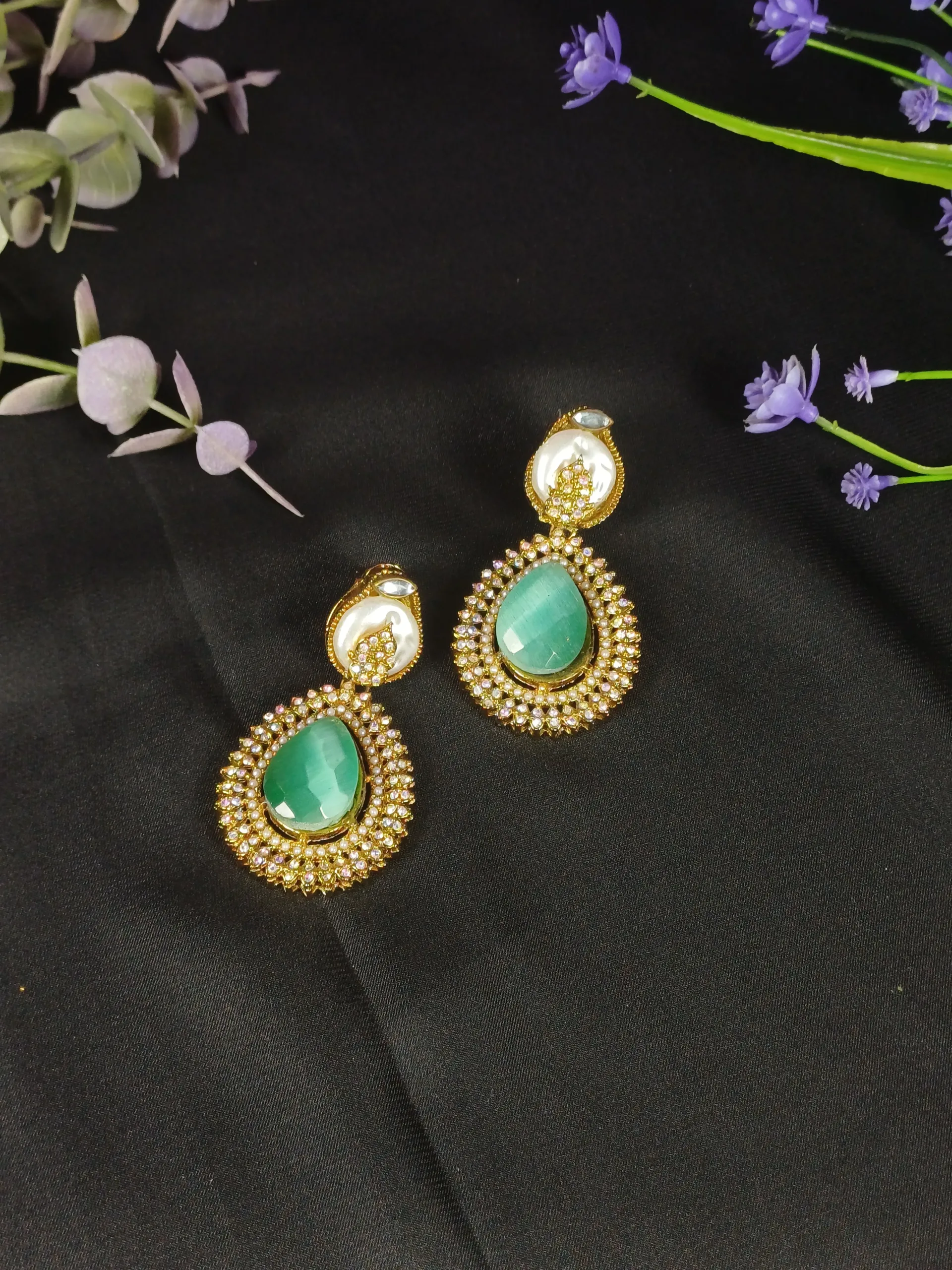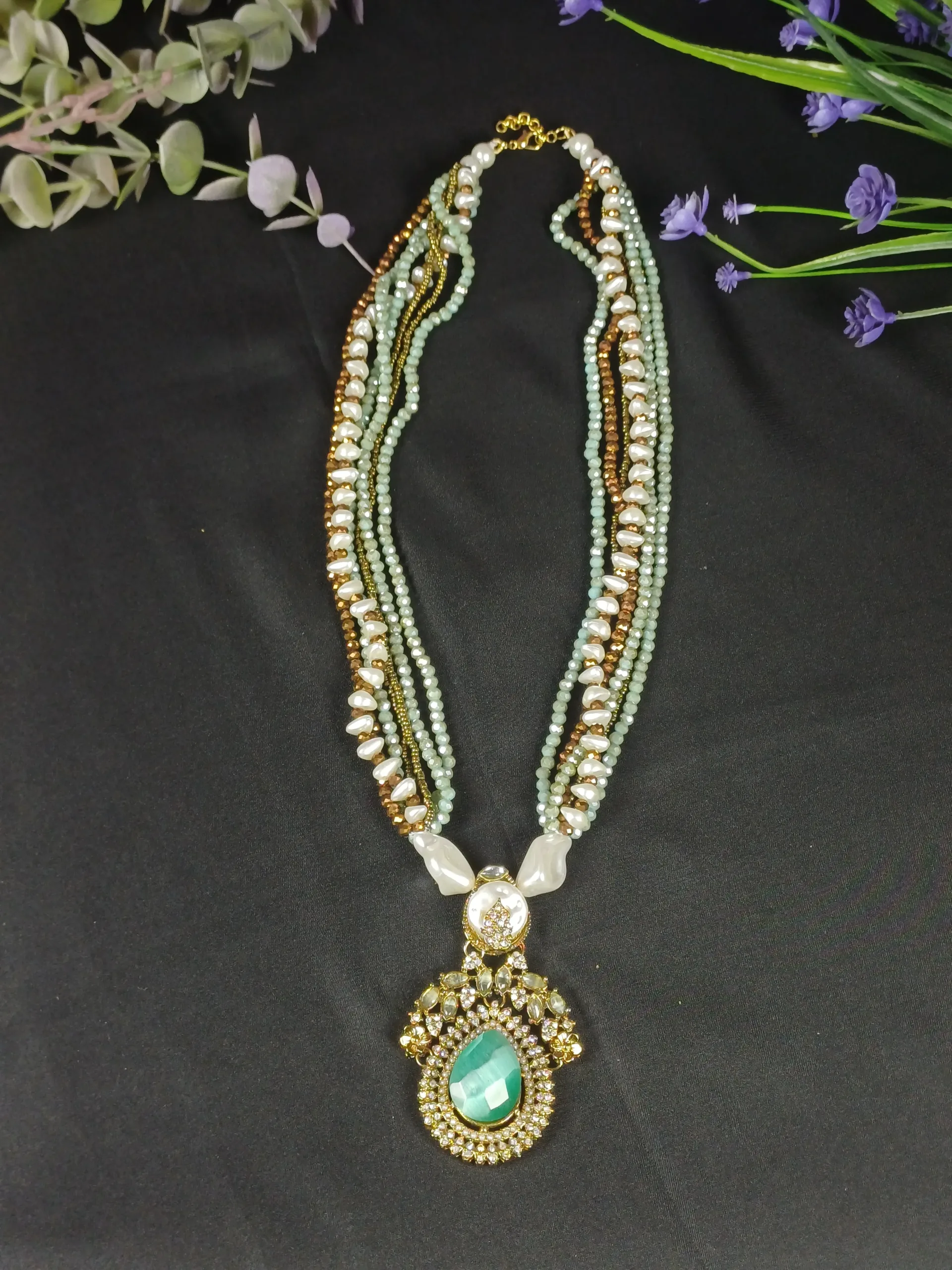 Mint mahal mala set with earrings with soft pastel tones for elegant events.