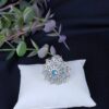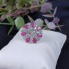 This sophisticated piece is an oval halo statement ring, featuring a soft green center stone surrounded by architectural crystalwork for a regal and radiant appearance.