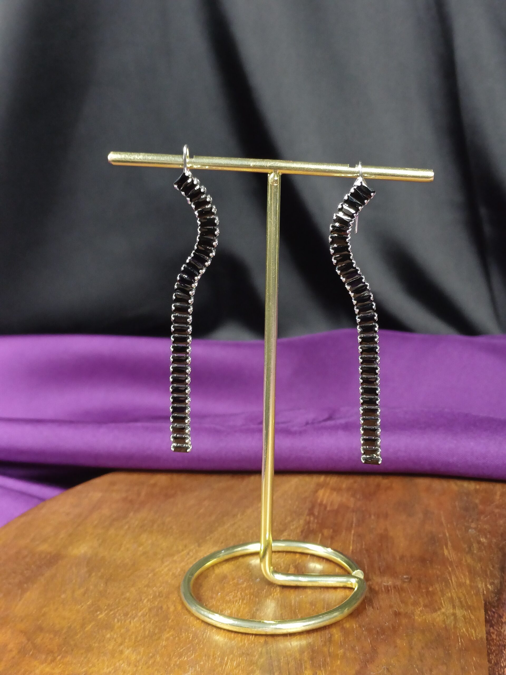 This sleek and sophisticated accessory is a pair of jet-black serpentine drop earrings, featuring a continuous stream of baguette-cut stones that offer a modern, architectural silhouette.