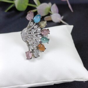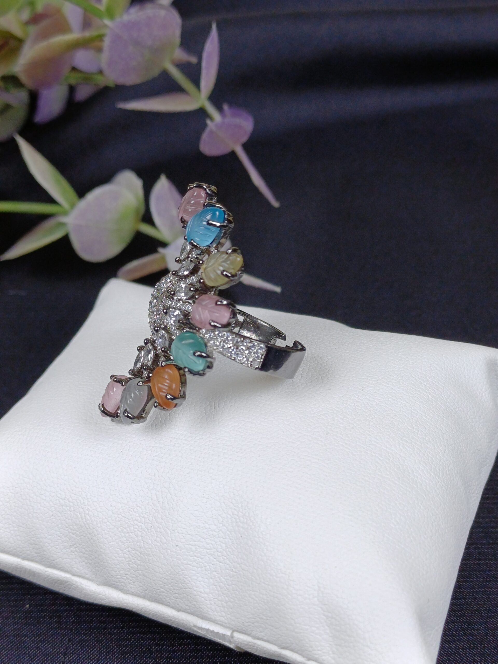 This striking piece is a multi-color leaf-motif statement ring, featuring an asymmetrical, fan-like design that combines sparkling crystalwork with soft, carved gemstones.