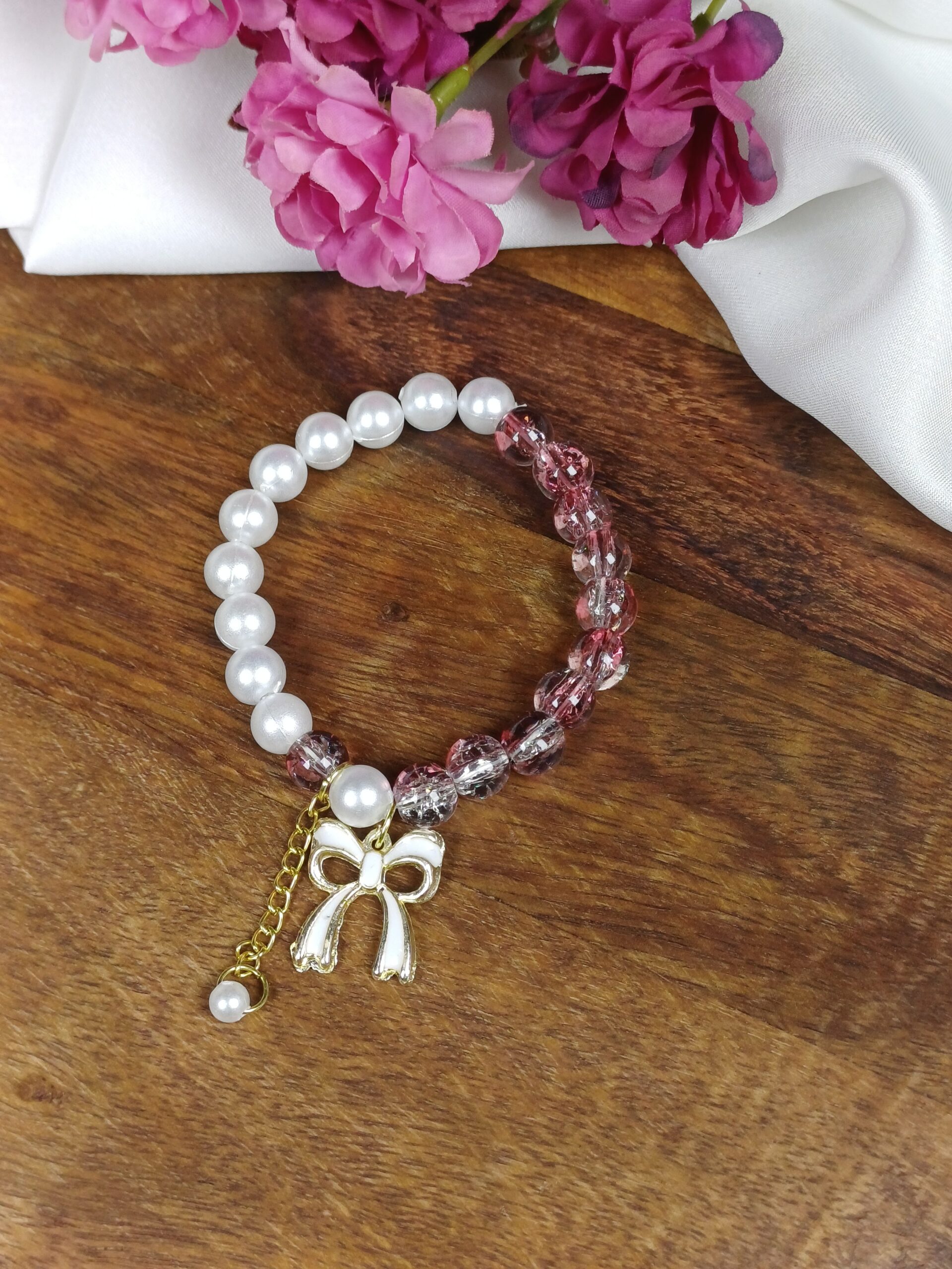 This vibrant and charming accessory is a dual-tone beaded charm bracelet, featuring a mix of classic elegance and colorful, textured glass elements.
