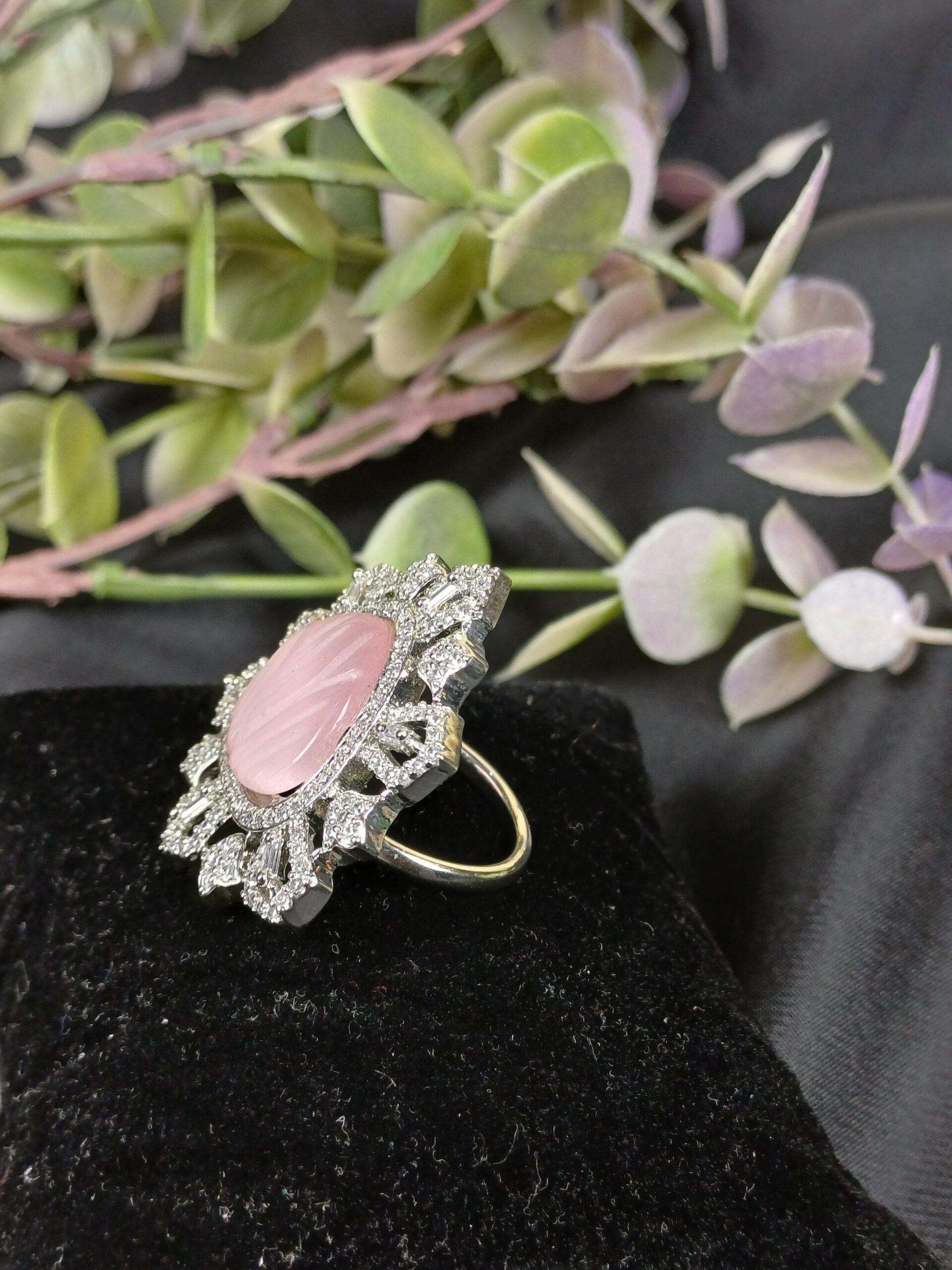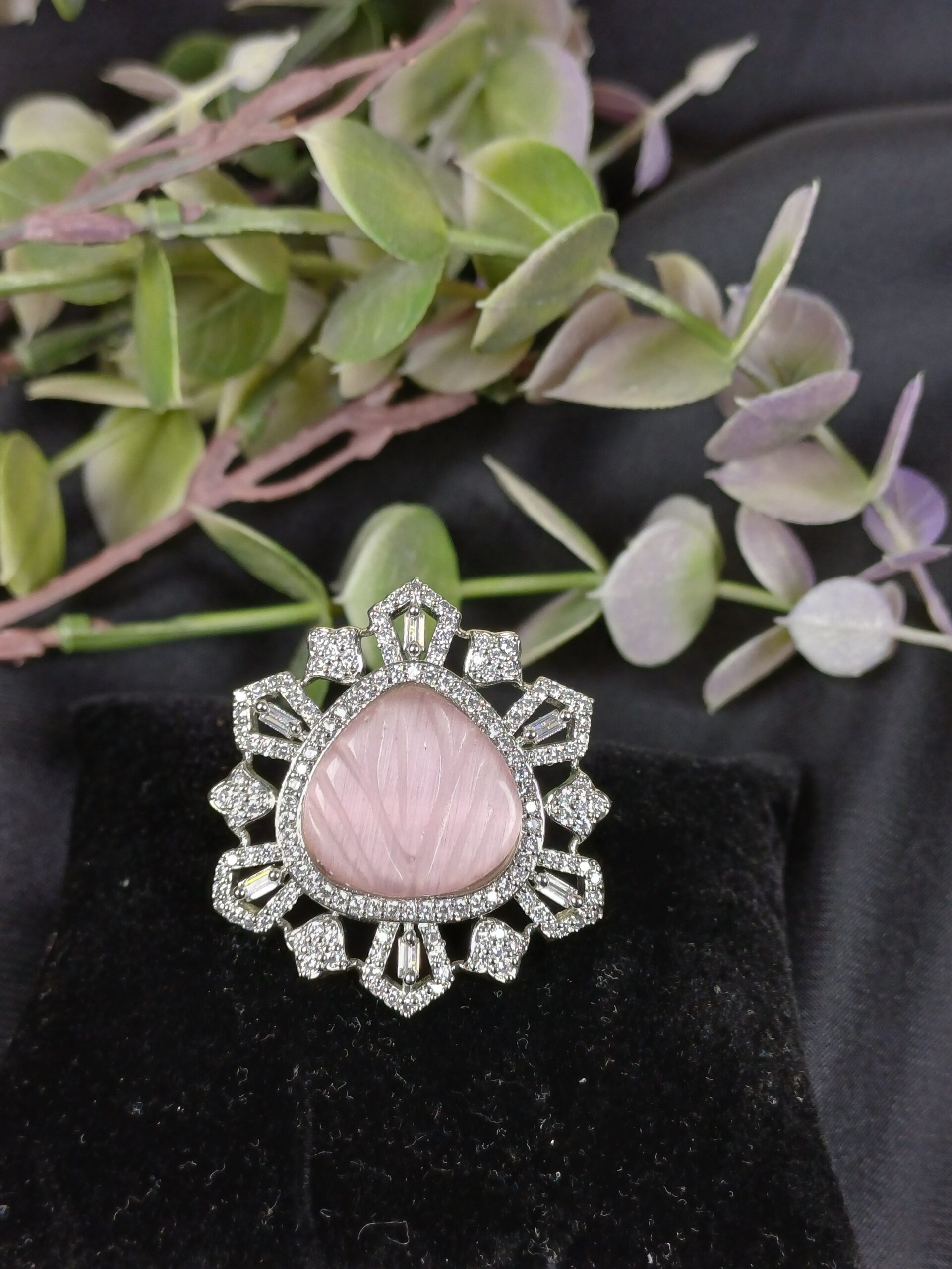 This elegant piece is a carved gemstone statement ring, featuring a romantic botanical design that blends intricate crystal craftsmanship with a soft, vintage-inspired center.