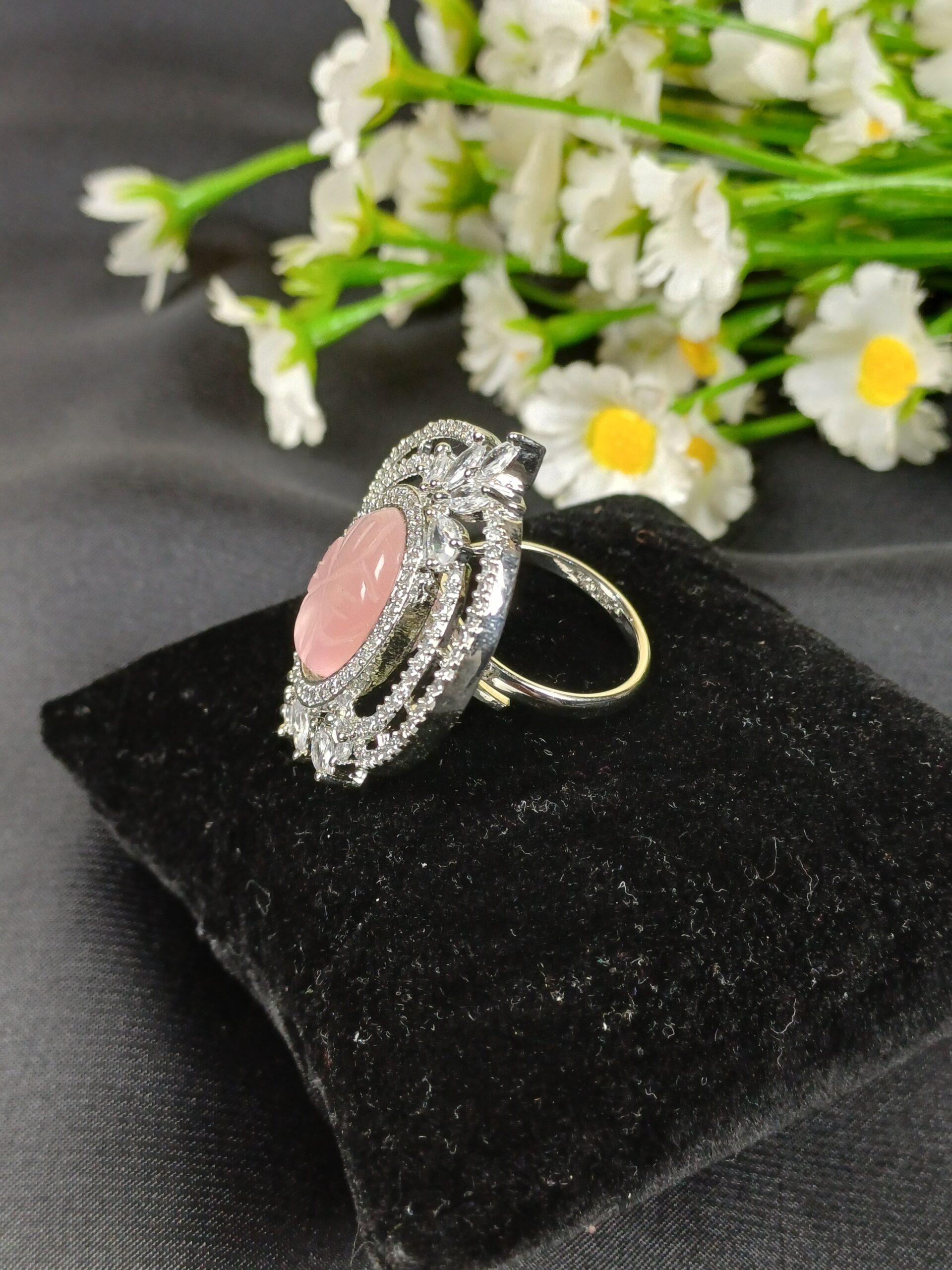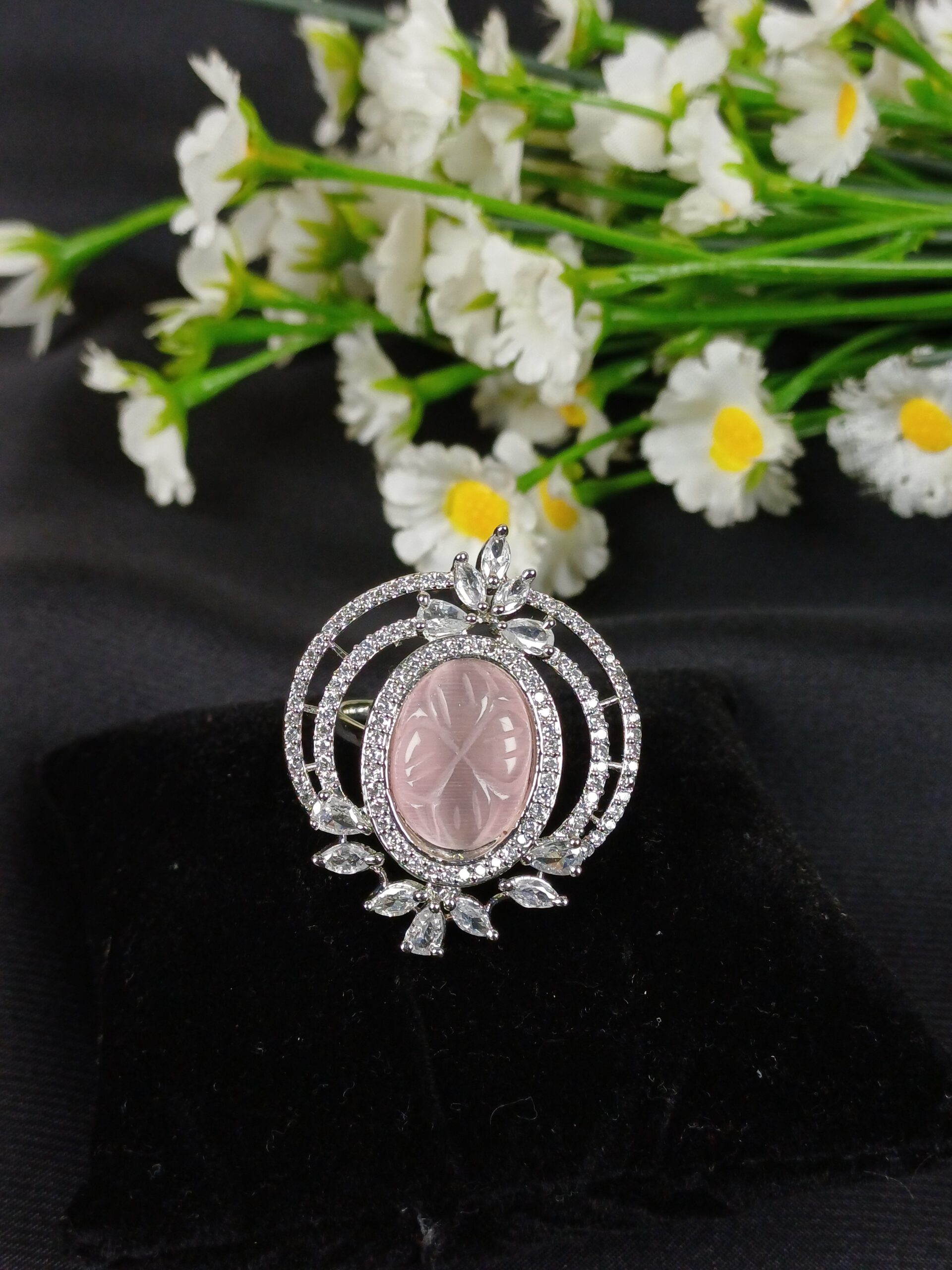 This elegant piece is an oval carved gemstone statement ring, featuring a romantic, garden-inspired aesthetic with an intricate celestial frame.