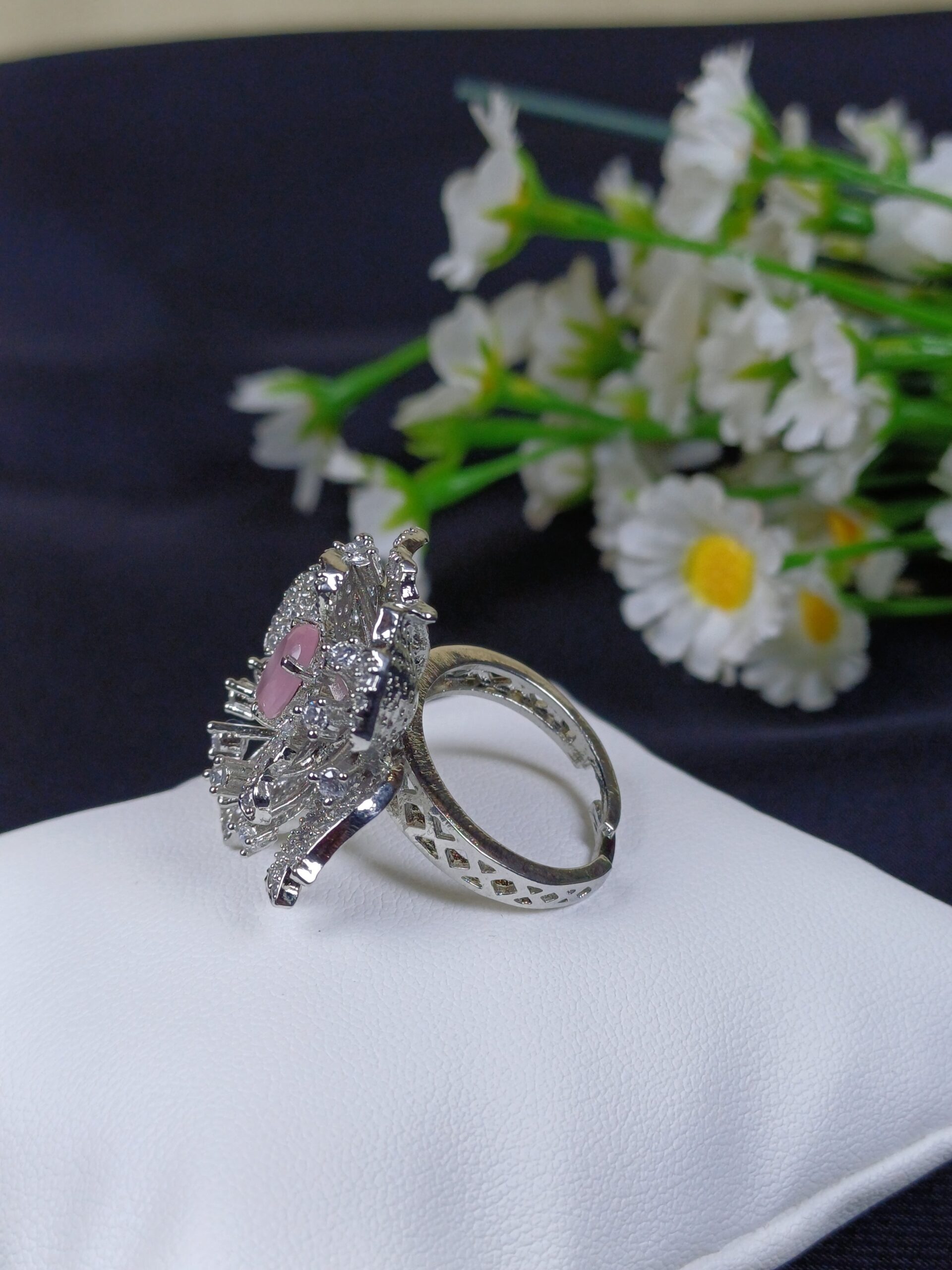 This final piece is a pink-and-silver floral cocktail ring, featuring an organic, multi-dimensional design that mimics a blossoming flower in full bloom.